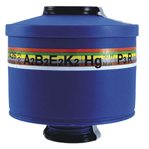 203-A2B2E2K2HgP3R: filtro combinato per vapori organici con punto di ebollizione superiore a 65°C, gas inorganici, gas acidi, anidride solforosa (SO2), ammoniaca (NH3) e suoi derivati organici, vapori di mercurio, polveri, fumi e nebbie.