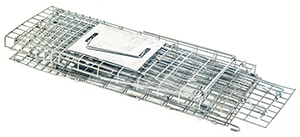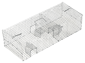 Gabbia ad elevata capienza in filo zincato elettrosaldato per la cattura non cruenta di ratti e piccoli animali. Il sistema a doppia camera con ingressi multipli ad imbuto facilita l’ingresso e non consente l’uscita agli animali una volta entrati.